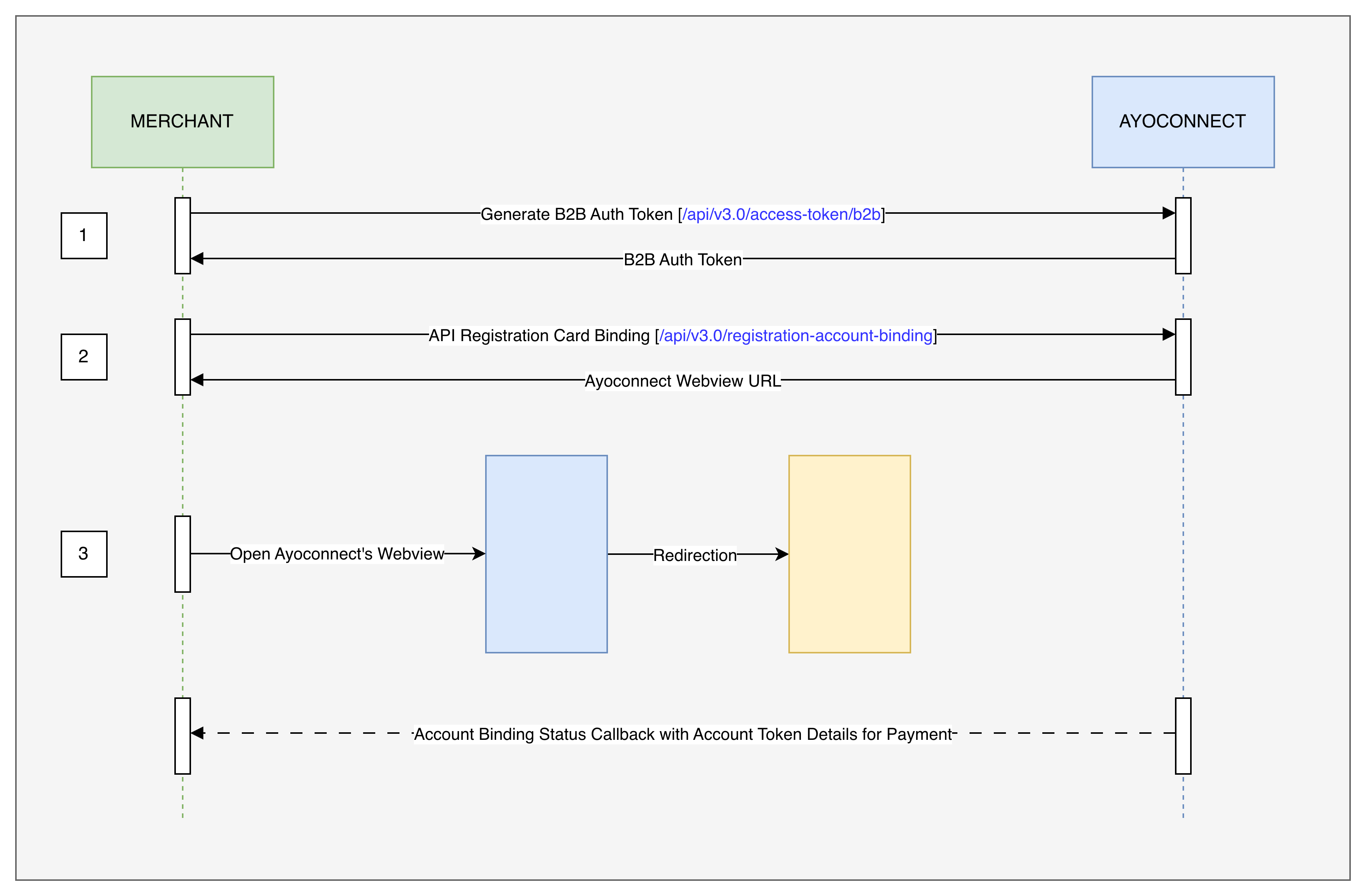 accountTokenand other details of the account that has been successfully binded to the user , which can be directly used for payments. - The default binding session (during webview) has an expiration time of 3 minutes. This value is configurable from Ayoconnect side based on your business preferences. However we generally do not recommend having session expiration time more than 60 minutes.